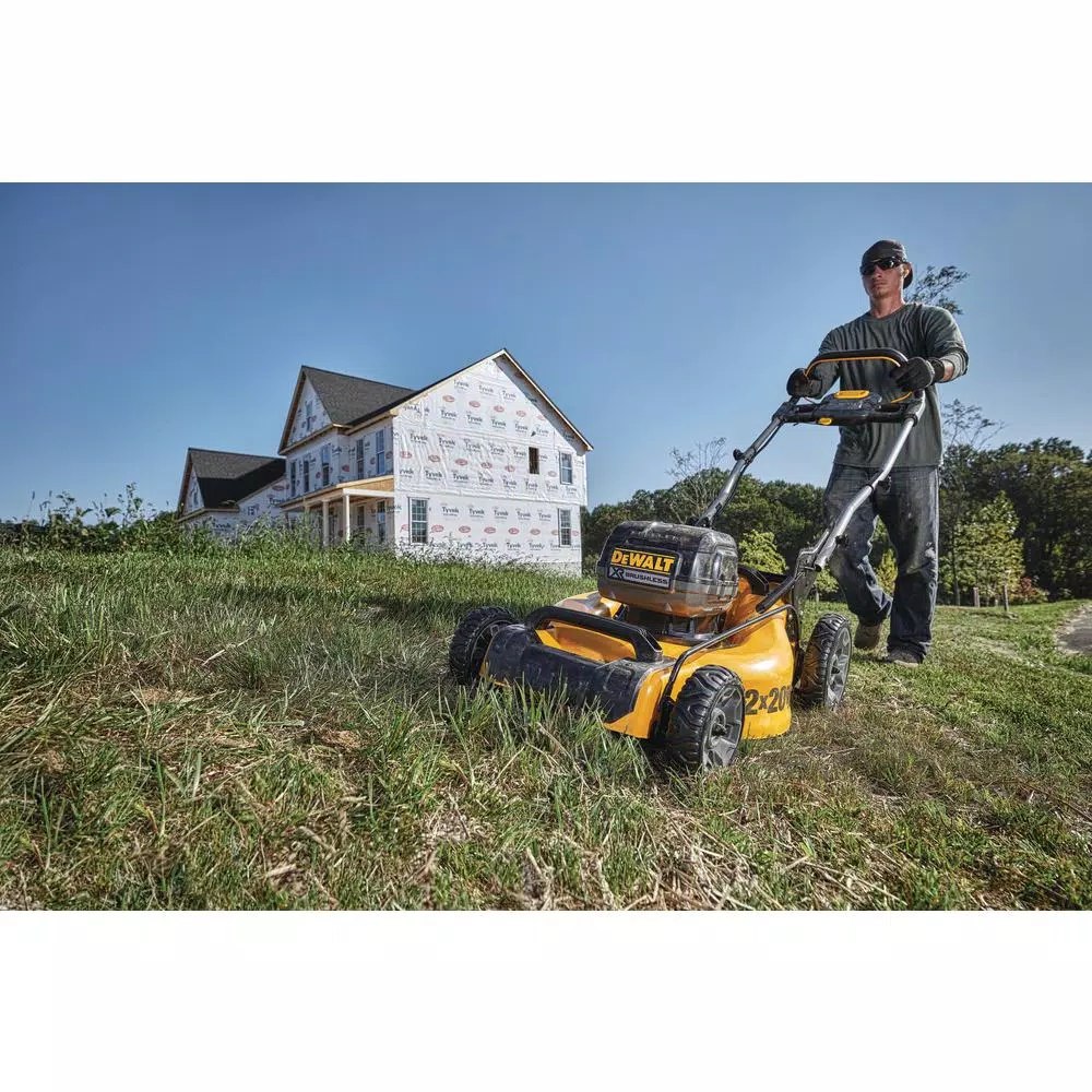 2X 20-Volt MAX DEWALT 3-in-1 Cordless Lawn Mower is powered by 2 DCB609 9.0 Ah FLEXVOLT batteries to deliver 2X the voltage. The high-output brushless motor delivers powerful performance and increases torque in high overgrowth. The lawn mower’s 3-in-1 capability allows for mulching, bagging or rear clipping discharge. It is perfect for properties up to 1/4 acre. For optimal performance, the battery-powered lawn mower can be paired with high capacity 20-Volt MAX DEWALT batteries or FLEXVOLT batteries for extended runtime and maximum compatibility across DEWALT battery systems. This cordless lawn mower is designed to help you get the job done with a 20 in. metal deck, quick and easy single lever height adjustment and folding handles for compact upright storage.