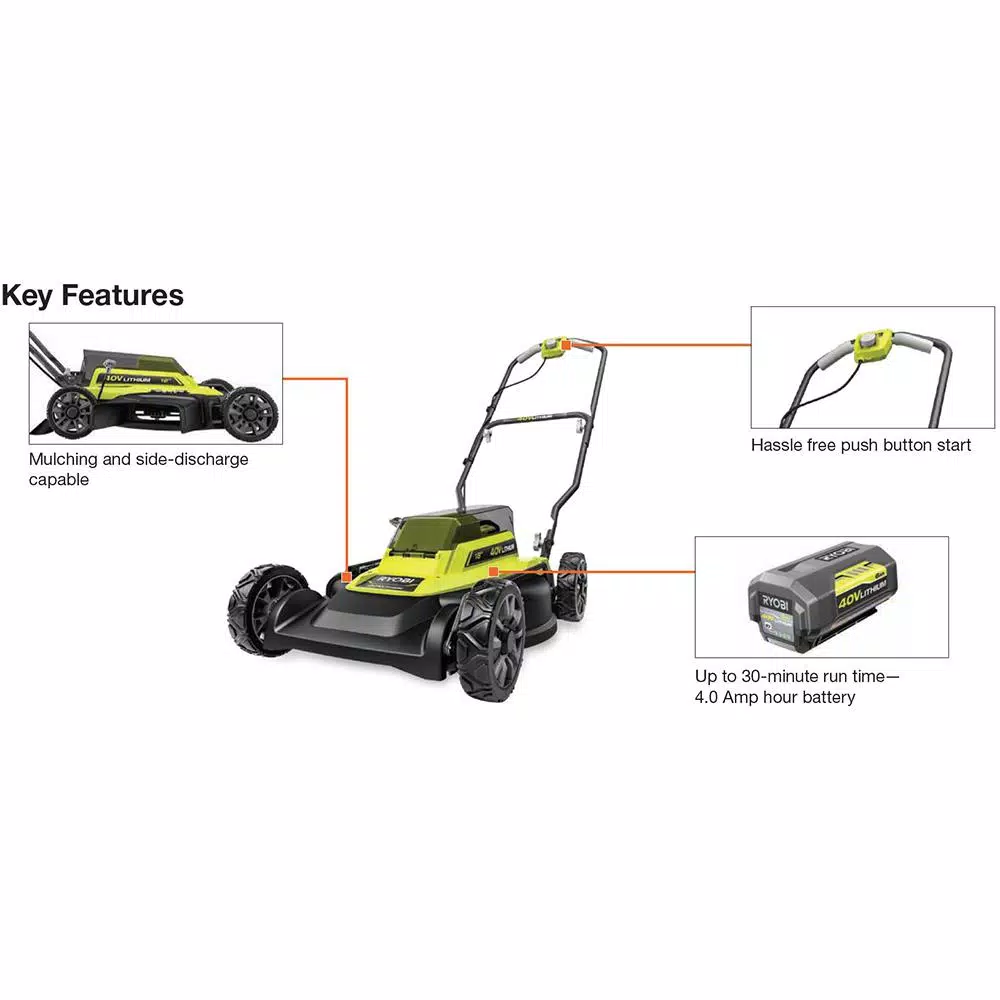 RYOBI continues to simplify yard work with the introduction of the 40-Volt Lithium-Ion 18 2-in-1 Cordless Lawn Mower. Powered by a 40-Volt 4 Ah Lithium-Ion Battery you can start mowing with the push of a button, instead of having to hassle with extension cords or mixing gas and oil. Select your ideal grass height from 1.5 to 4 with the 7-position single point height adjustment. The 2-in-1 mulching and side discharge options let you choose which mowing function is best for your yard. Release the mulch door before mowing to fertilize your lawn with clippings or insert the side discharge chute to discharge your clippings to the side. The compact design features a sleek 18 deck, collapsible handles, and upright storage capability, making it ideal for storage in tight spaces. This mower and the 2 included batteries are compatible with all RYOBI 40-Volt tools, batteries, and chargers. Backed by a 5-Year Limited Warranty.