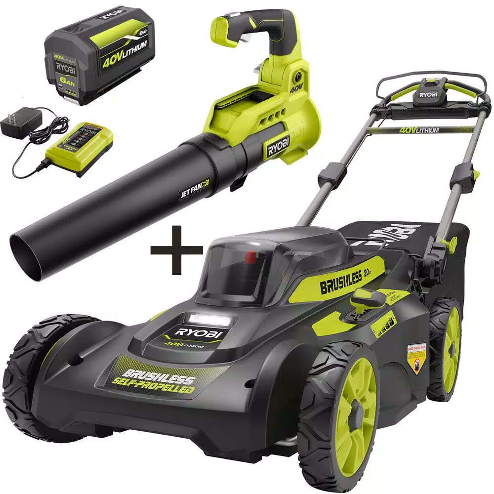 RYOBI continues to lead the industry in cordless mower innovation with their-second generation 40V 20 in. Brushless Self-Propelled Mower. Combining 40V Lithium-Ion Battery power with Brushless Technology this mower delivers gas-like power without the hassle of gas, oil or maintenance. The high capacity 6 Ah battery provides extended run-time and instant power at the push of a button. Choose between bagging or mulching your grass to get your desired results or purchase the side discharge accessory online (AC040VSD01) for 3-in-1 mulching, bagging and side discharge capability. Select your ideal grass height with the 7-position single point height adjustment. If you prefer mowing in the cool evening, LED headlights provide the perfect solution. When the job is done remove the Easy-Lift single motion lock and release bagger to empty your grass and lock it back in place. With collapsible telescoping handles, this mower easily folds down and can be stored vertically making it ideal for compact spaces. The RYOBI 40V Jet Fan Blower uses Gas-Like Power to make yard cleanup a breeze. The jet fan design increases air flow, delivering 525 CFM and 110 MPH of clearing power. The variable speed trigger allows control of the output of air, making this blower perfect for heavy or light-duty jobs. Press the turbo button for max power to clear heavier leaves and debris. Both tools are compatible with the RYOBI 40V system of tools, batteries, and chargers and backed by a 5-year tool warranty.