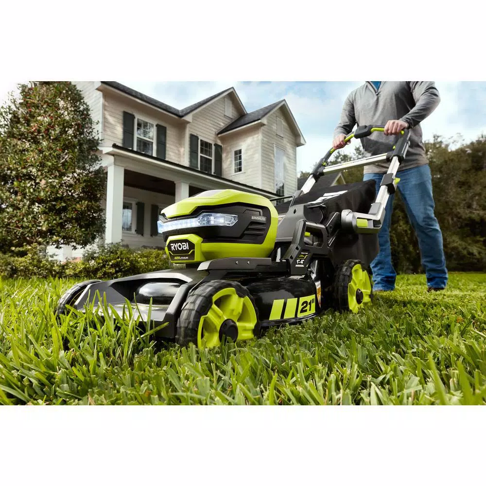 RYOBI is leading cordless innovation with the introduction of the RYOBI 40-Volt 21 in. SMART-TREK Self-Propelled Mower. This self-propelled mower features SMART TREK technology that adapts to the user’s walking speed and has rear wheel drive for increased traction when mowing your yard. The brushless motor delivers gas-like power combined with load sensing technology that detects and delivers the power needed to maintain an optimal cutting speed, resulting in maximum power and run time. Featuring a 21 in. durable steel deck, this mower was redesigned with a 7-position single-point height adjustment (ranging from 1-1/2 in. – 4 in.) that allows you to select your mowing height with one single motion. Choose which mowing option is best for you with the 2-in-1 mulching or bagging capability, or the side discharge accessory sold online. When the job is done, simply remove the Easy-Lift Single-Motion lock and release bagger to empty your grass and place back down to easily lock it back into place. The collapsible step-to-release handles offer a variety of storage options for compact spaces. The 6.0 Ah 40-Volt Lithium Ion high capacity battery offers extended run time, and is compatible with all RYOBI 40-Volt tools. Backed by a 5-year warranty.