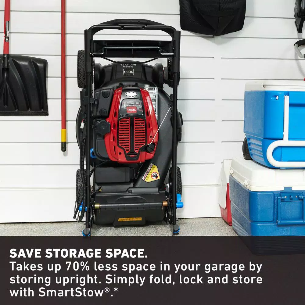 - Save storage space; the battle to free up space in your garage is always fierce, and odds are your lawn mower ends up wherever you can jam it, whether it fits or not; now you can fold, lock and store your Toro practically anywhere in your garage or shed with SmartStow