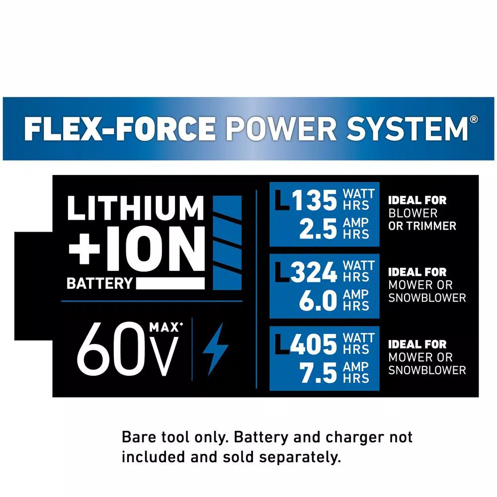 - Charged up; not included and sold separately, L324 battery (60-Volt MAX, 6.0 Amp-hour, 324-Watt-hours) is available and compatible with all 60-Volt Flex-Force power system tools. With 324-Watt-hours, it can cut up to 1/3 of an acre on a full charge; or, choose the L405 battery for 25% more runtime (Model: L324 88660, L405 88675)