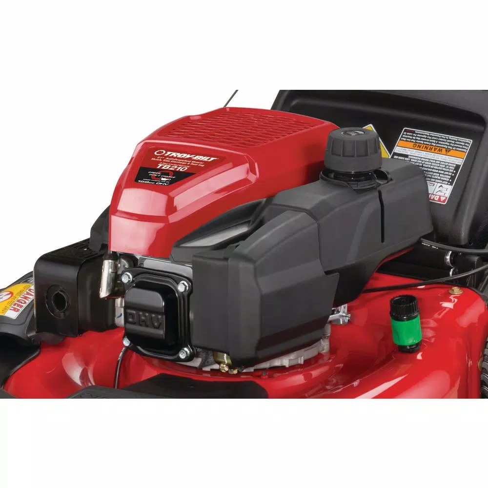 Eliminate oil changes on the Troy-Bilt TB210 self-propelled mower with innovative Troy-Bilt OHV engine with Check, Don’t Change system. Simply check the oil each time and top off as needed, reducing maintenance time and having to dispose of old oil. Variable speed front wheel drive improves control and allows for faster turning while mowing. With rear bag, mulch kit and side discharge options included, you have a choice for disposing of grass clippings. Dual-lever height adjusters are conveniently located to quickly adjust the cutting height and the TriAction cutting system uses a rake guard, symmetrical deck and specialized blade to deliver a clean, even cut every time. You can depend on Troy-Bilt to keep yardwork from feeling like a chore, and we won’t let you down.
