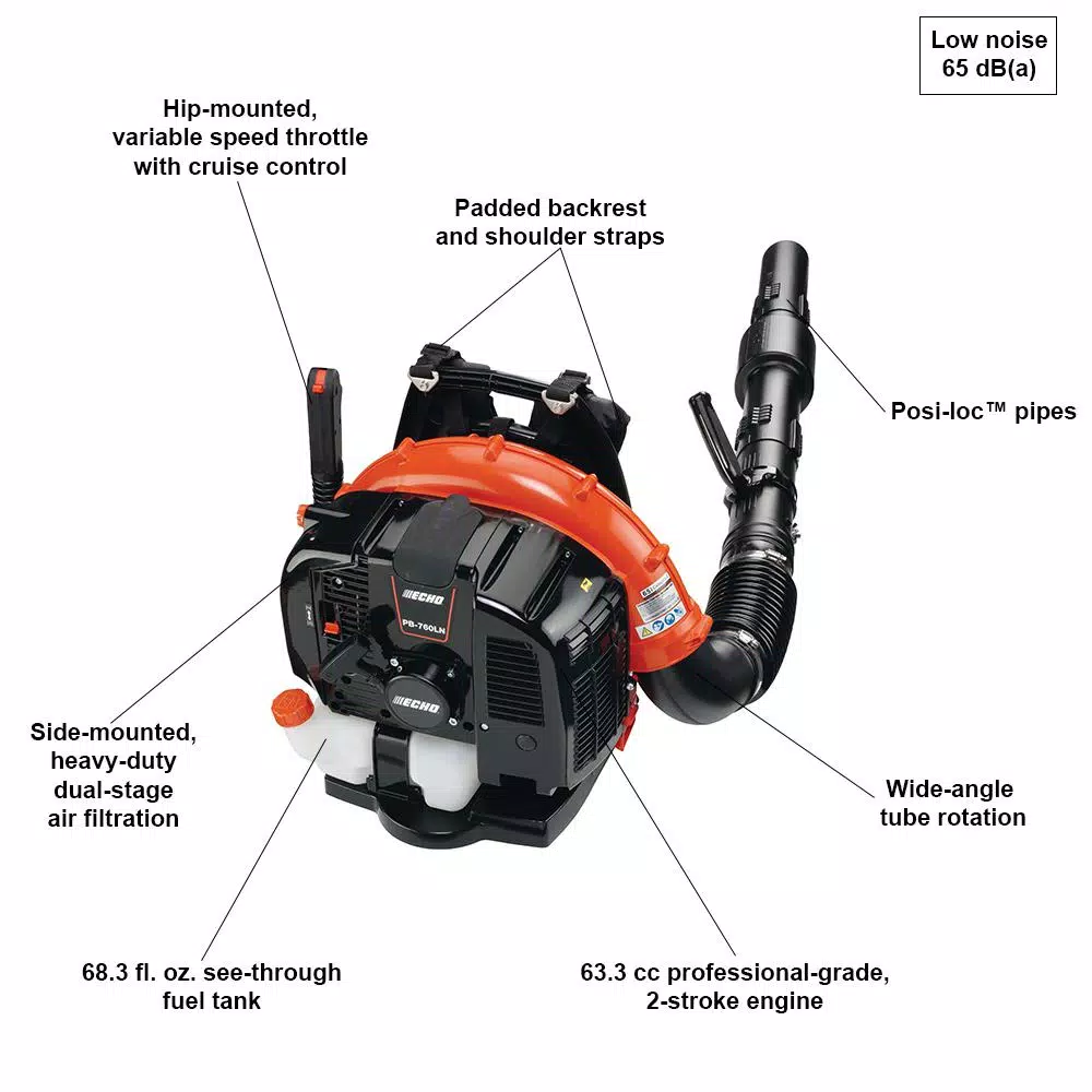 The ECHO PB-760LNH gas leaf blower is the most powerful low-noise blower available. The professional grade 63.3 cc engine featured on this lawn blower produces 535 CFM at 214 MPH for a quick and easy clean-up for the largest jobs. The yard blower comes with a 5-year consumer/2-year commercial warranty.