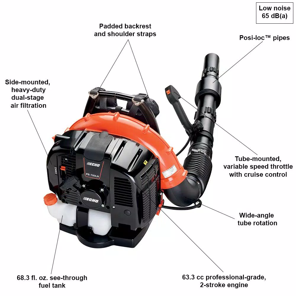 The ECHO PB-760LNT gas leaf blower is the most powerful, low-noise blower available. The yard blowers professional grade 63.3 cc engine produces 535 CFM at 214 MPH for quick and easy clean-up of the largest jobs. The gas blower unit comes with a 5-year consumer/2-year commercial warranty.