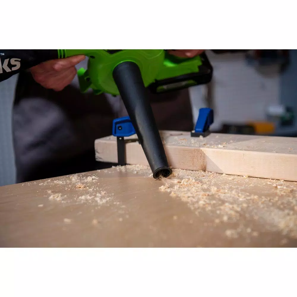- Powerful 24-Volt motor provides 180 CFM at 90 MPH for light-duty clean-up in garage or shop