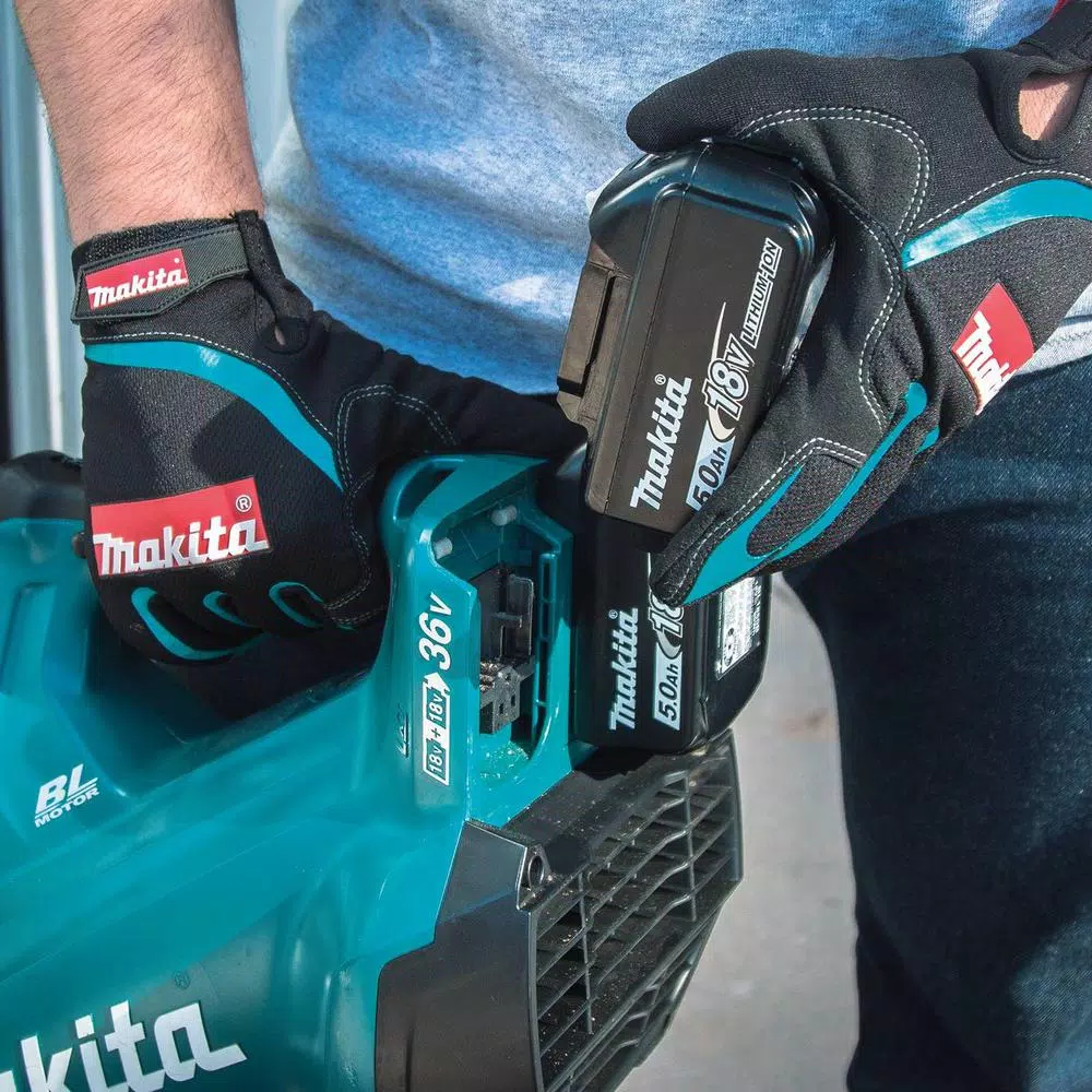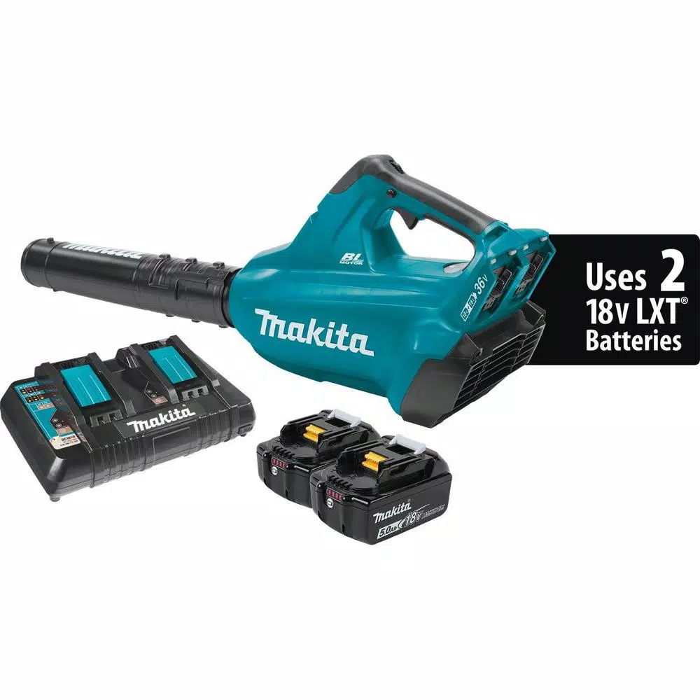 Landscapers and contractors are demanding more cordless alternatives to gas-powered outdoor power equipment. Makita is meeting demand with an expanding line of cordless OPE that includes the 18-Volt X2 LXT Lithium-Ion (36-Volt) Brushless Blower. With zero emissions and lower noise, the 18-Volt X2 (36-Volt) Cordless Blower is a welcome solution for clean-up applications. Its powered by two 18-Volt LXT batteries for maximum power and run time, but without leaving the 18-Volt battery platform. With the efficient Makita BL brushless motor, the blower delivers longer run time, increased power and speed, and longer tool life. Model XBU02PT is a kit and includes the Blower, 2 fast-charging 18-Volt LXT Lithium-Ion 5.0Ah batteries and an efficient 18-Volt Dual Port Rapid Optimum Charger. Makita efficient BL Brushless motor is electronically controlled to optimize battery energy use for up to 50% longer run time per battery charge than similar non-brushless tools. Electronic controls efficiently use battery energy to match the changing demands of the application for increased power and speed when needed. With no carbon brushes, the Makita BL Brushless motor runs cooler and more efficiently for longer life. When powered by two 18-Volt 5.0Ah batteries, the efficient brushless motor delivers up to 28 minutes of run-time on dial setting #3 on a single charge.