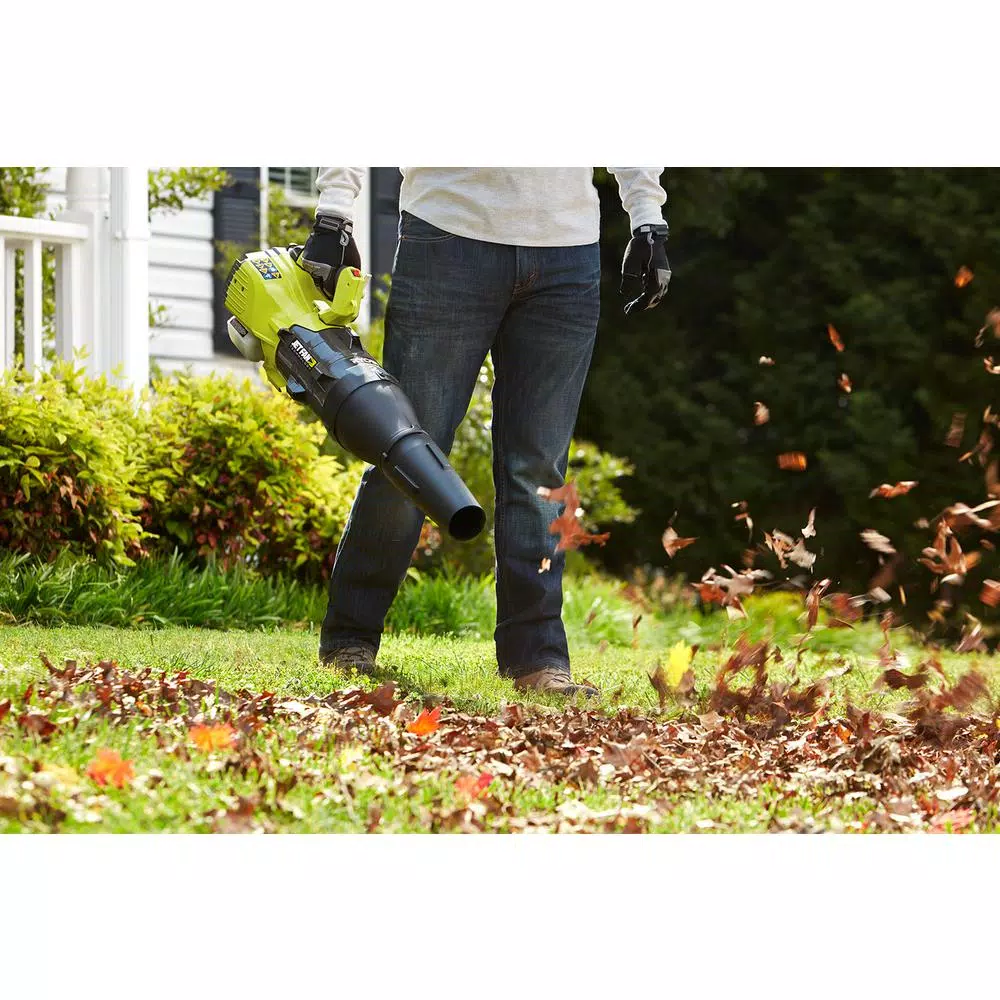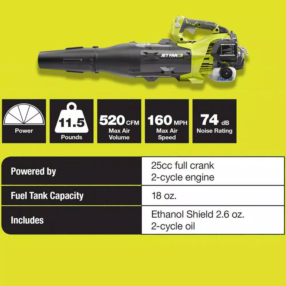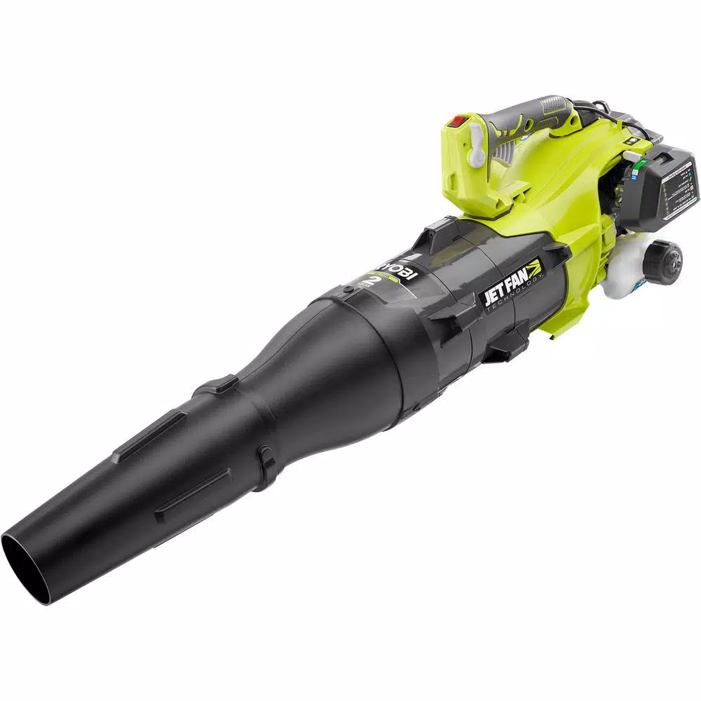 The RYOBI 2 Cycle Jet Fan Blower is the most powerful gas handheld blower. Period. Producing 520 CFM at 160 MPH, this blower delivers backpack performance in a compact, handheld size. This blower features an innovative 3-stage jet fan design for maximum clearing force and a full crank engine for longer life. With its variable speed trigger with cruise control, you have the power to move large debris and the control to clear a delicate flower bed. This blower also has an anti-vibe handle with over molded grips for optimized user comfort. Backed by a 3-year warranty.