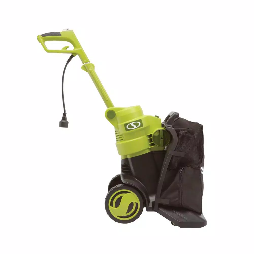 Clear yard debris like a pro with this Sun Joe walk-behind electric blower, vacuum and mulcher. There’s no need to rake piles of leaves or dirt – this machine lets you vacuum your yard, driveway or deck like a rug. The 14 amp motor delivers maximum suction so you can clear the patio, porch, garage or workshop in no time. Its impeller’s 15:1 reduction ratio mulches dry leaves, sawdust, dirt and debris into an 8-gallon collection bag as it cleans, leaving the area spotless. Durable, easy-glide wheels make it simple to take it anywhere you need to go.