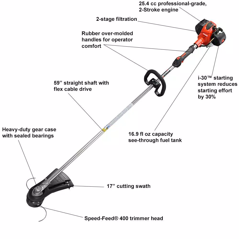 - Weed trimmer features a 25.4 cc professional-grade 2-stroke engine