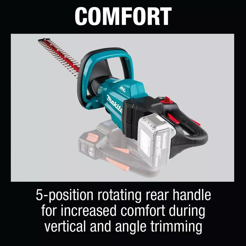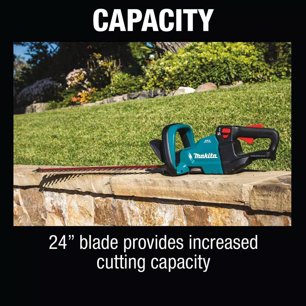 The Makita 18-Volt LXT Brushless Cordless 24 in. Hedge Trimmer (model XHU07Z, tool only) is part of Makita’s wide range of cordless outdoor power equipment. The XHU07Z Hedge Trimmer has a 24 in. blade for increased cutting capacity and a 5-position rotating handle for increased comfort when trimming vertically or at an angle. A Makita-built brushless motor delivers 4,400 SPM for faster cutting speed when set on the high speed option. The cordless XHU07Z has zero emissions and reduced maintenance: there’s no engine oil to change, no spark plug to replace, and no air filter or muffler to clean. And there’s no need to drain the fuel for storage. Simply pickup your XHU07Z, load an 18-Volt LXT Lithium-Ion battery (sold separately), and the trimmer is ready to use. The XHU07Z part of Makita’s expanding 18-Volt Lithium-Ion system, the worlds largest cordless tool line-up powered by an 18-Volt Lithium-Ion slide-style battery. Makita 18-Volt Lithium-Ion batteries have the fastest charge times in their categories, so they spend more time working and less time sitting on the charger.