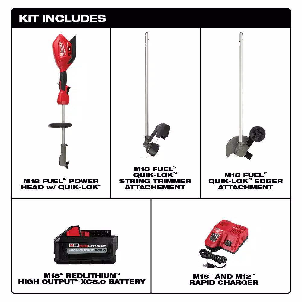 - Includes: M18 FUEL power head (2825-20), string trimmer attachment (49-16-2717), M18 REDLITHIUM HO 8.0 Ah battery (48-11-1880) and M18 and M12 rapid charger (48-59-1808), M18 FUEL 8 in. edger attachment for Milwaukee QUIK-LOK attachment system