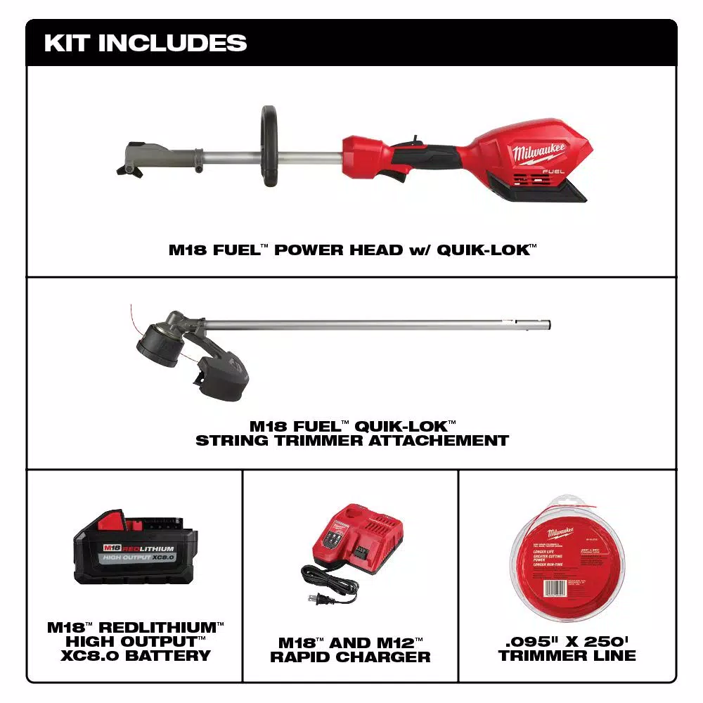 - Includes: M18 FUEL power head with quick-lok (2825-20), M18 FUEL QUIK-LOK string trimmer attachment (49-16-2717), M18 REDLITHIUM HO 8.0 battery (48-11-1880) and M18 and M12 rapid charger (48-59-1808), 0.095 in. x 250 ft. trimmer line (49-16-2713)