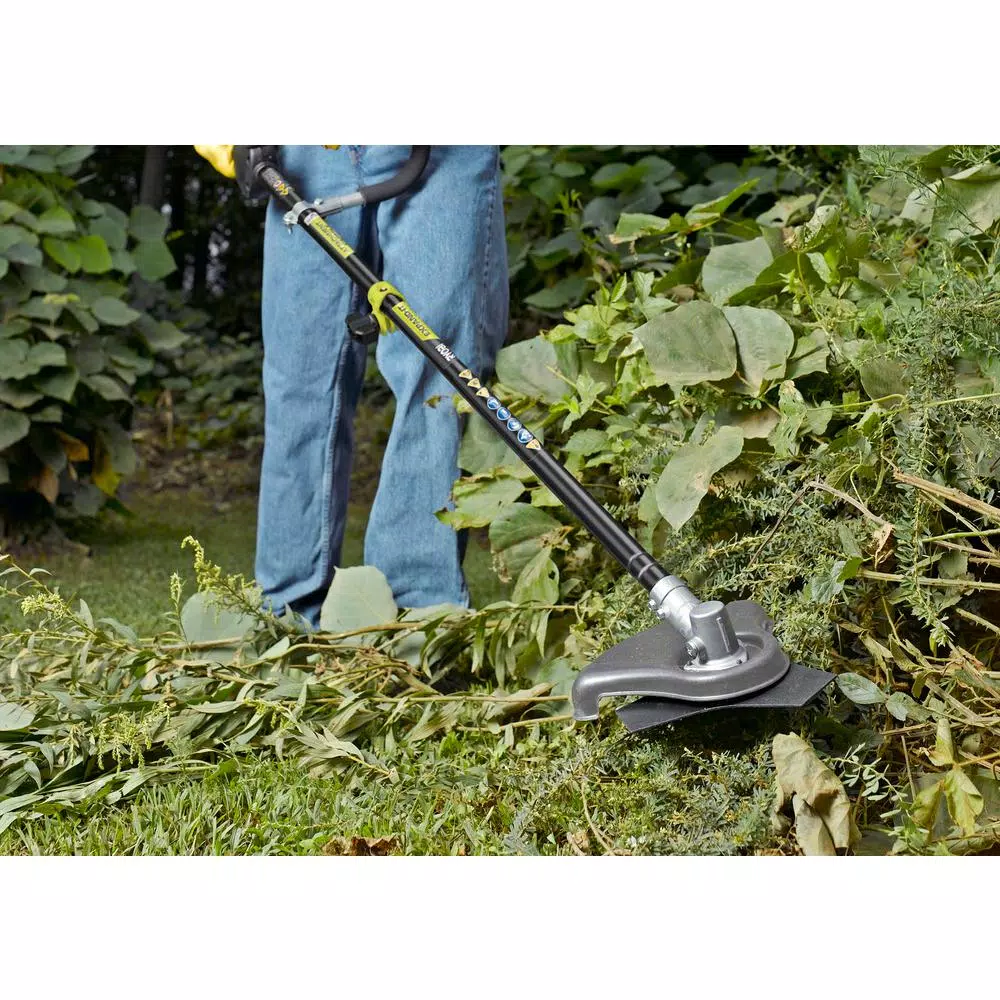 Introducing the RYOBI 2-Cycle Gas Brush Cutter with a full crank engine for 2-times longer life. This brush cutter accepts RYOBI Expand-It Universal Brand Fit attachments, adding versatility to your tool. Simply attach an Edger, a blower, or even a tiller to the power head and quickly move from project to project. Save time, save space and save money with the RYOBI Expand-It System. The RYOBI Tri-Arc steel blade is perfect for thicker weeds and brush and it is reversible for longer life. Users will experience easier starting with the Zip Start carburetor and included Ethanol Shield 2-Cycle Oil. Backed by a 3-year warranty, trust the RYOBI 2-Cycle Gas Brush Cutter for your outdoor clearing needs.