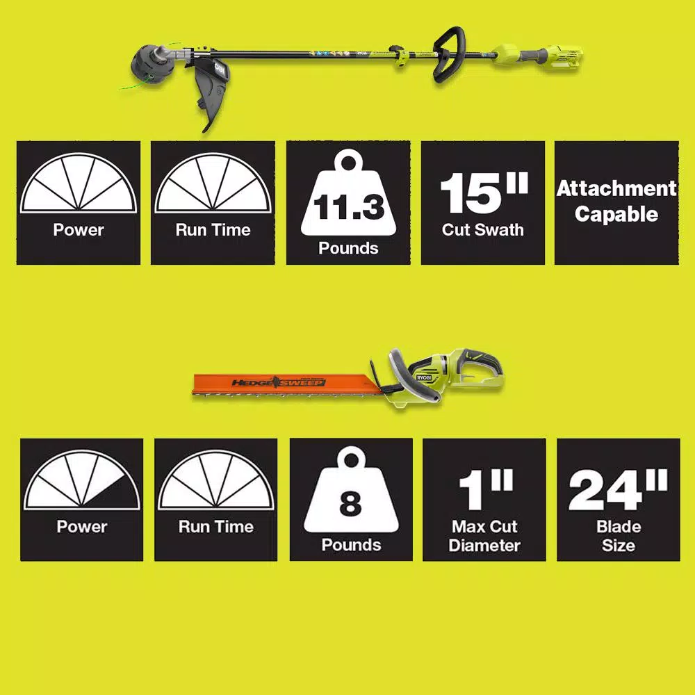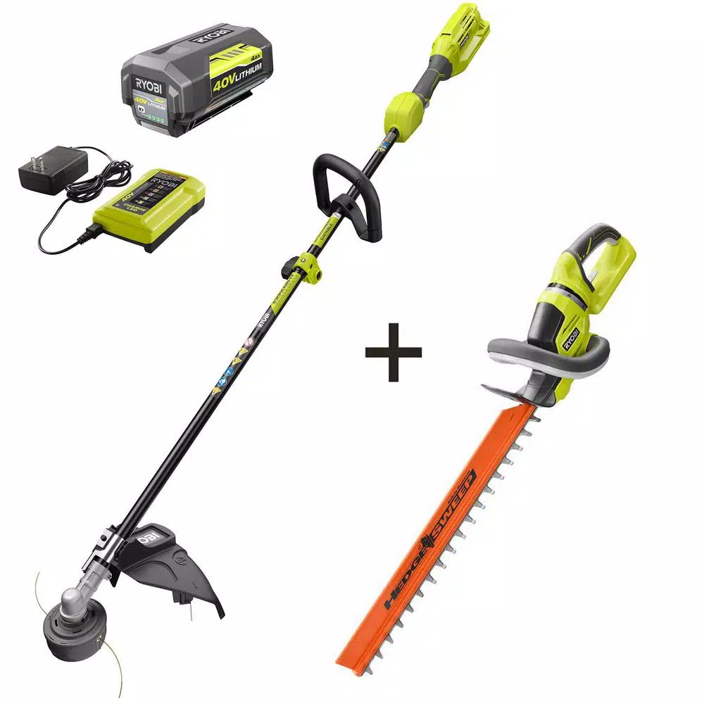 Gas-like power you want, attachment capability you need. The RYOBI 40-Volt X Expand-it Trimmer delivers power like a gas trimmer, with none of the hassle of mixing oil and gas. Attachment capability means you can add on RYOBI Expand-It attachments, saving you time, money and space. The RYOBI 40-Volt X Expand-It Cordless Trimmer comes with premium 0.080 in. dimpled line and the REEL-EASY bump-feed string head for faster reloads, usually found only on gas trimmers. The cutting width is adjustable for longer run time or wider cutting width. This trimmer is recommended for yards up to 1-Acre. Also included, the RYOBI 40-Volt 24 in. Cordless Hedge Trimmer delivers Gas-Like power and longer run time than a gas hedge trimmer. The dual action steel blades offer an aggressive 1 in. cutting capacity, all while reducing unsafe vibration. Other features include a rotating rear handle for precision cutting at any angle, along with a wrap-around front handle for ultimate control. Featuring the innovative Hedge Sweep design, this trimmer easily clears debris and clippings while you trim. The perfect combination of power and innovation, both tools are backed by a 5-year warranty. The battery is backed by a 3-Year Warranty.