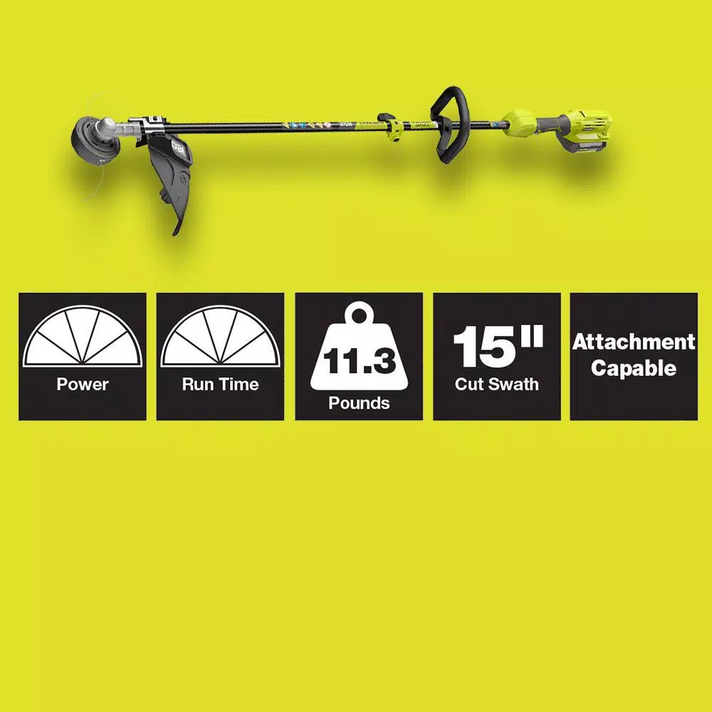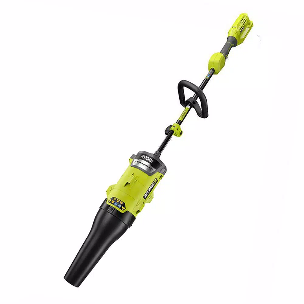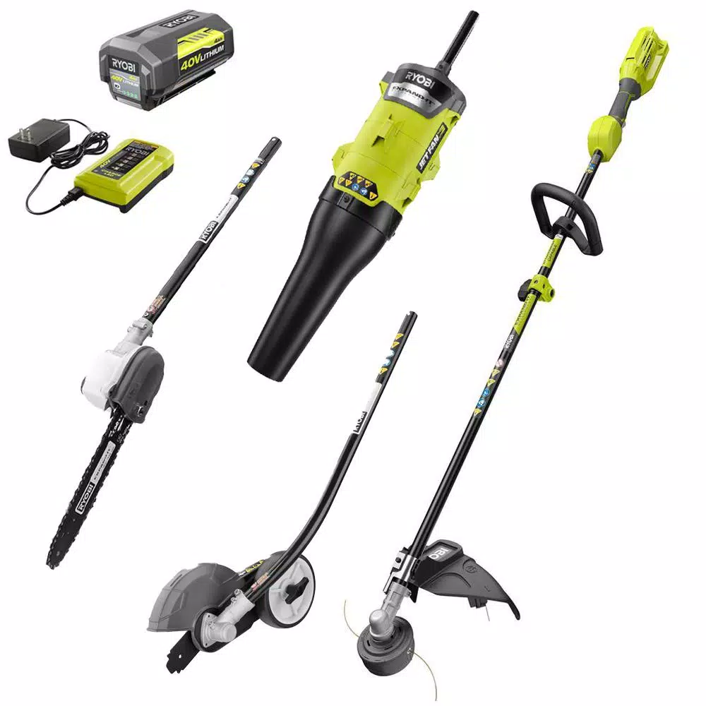Gas-like power you want, attachment capability you need. The RYOBI 40-Volt X Expand-it Trimmer delivers power like a gas trimmer, with none of the hassle of mixing oil and gas. Attachment capability means you can add on RYOBI Expand-It attachments, saving you time, money and space. The RYOBI 40-Volt X Expand-It Cordless Trimmer comes with premium 0.080 in. dimpled line and the REEL-EASY bump-feed string head for faster reloads, usually found only on gas trimmers. The cutting width is adjustable for longer run time or wider cutting width. This trimmer is recommended for yards up to 1-Acre. Also included, the RYOBI Expand-It Edger Attachment allows you to transform your string trimmer into a powerful edger. Also included, you can add the power of Jet Fan Technology to your string trimmer with the RYOBI Expand-It Jet Fan Blower. Additionally, the RYOBI Expand-It 10 in. A Pole Saw Attachment features a 10 in. bar and chain that is ideal for pruning and cutting limbs up to 6 in. thick.
