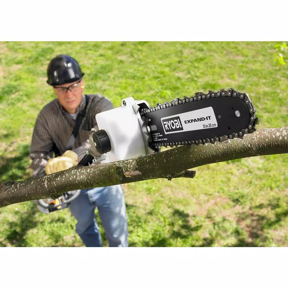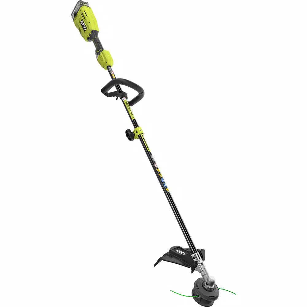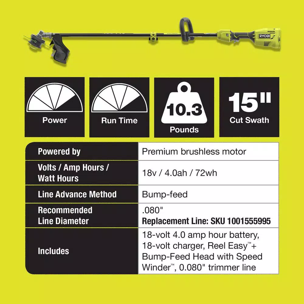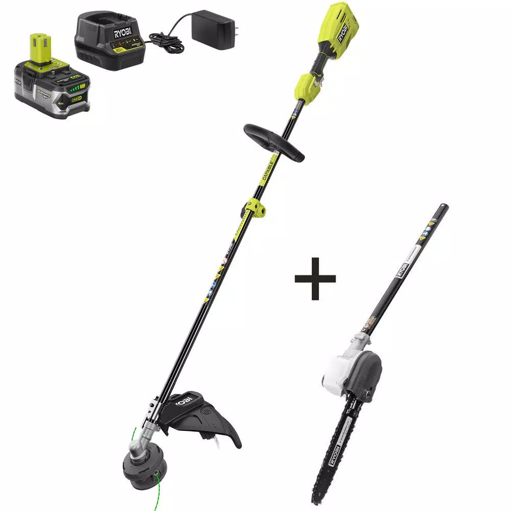 RYOBI is continuing to change the landscape of 18-Volt string trimmers by delivering superior power that rivals that of gas with the ONE+ Lithium+ 18-Volt Brushless String Trimmer. This trimmer has a brushless motor for maximum power and durability. The Expand-it attachment capability allows you to transform your trimmer into an edger, blower, pole saw and many more tools with the available attachments. This trimmer is equipped with the Reel Easy plus Bump Feed Head with Speed Winder which can be reloaded in 60-seconds or less. The variable speed trigger and 2-speed switch deliver increased control for any application. The adjustable 13 in. to 15 in. cutting width allows you to optimize your trimmer for increased run time or a wider cut swath. This lightweight and well-balanced design also has a 4.0 Ah battery for extended run time. The battery and charger that are included are compatible with over 125 tools on the RYOBI ONE+ system. Backed by a 3-year warranty. Also included, the RYOBI Expand-It 10 in. A Pole Saw Attachment features a 10 in. bar and chain that is ideal for pruning and cutting limbs up to 6 in. thick. Reach dead branches or overgrown limbs up to 12 ft. above the ground with the included extension shaft. An automatic lubrication feature helps keep the attachment well-oiled during use. This pole saw attachment can be used with RYOBI, Toro, Weed Eater, Troy Bilt, Murray, Poulan Pro and other universal brand fit power heads and trimmers.