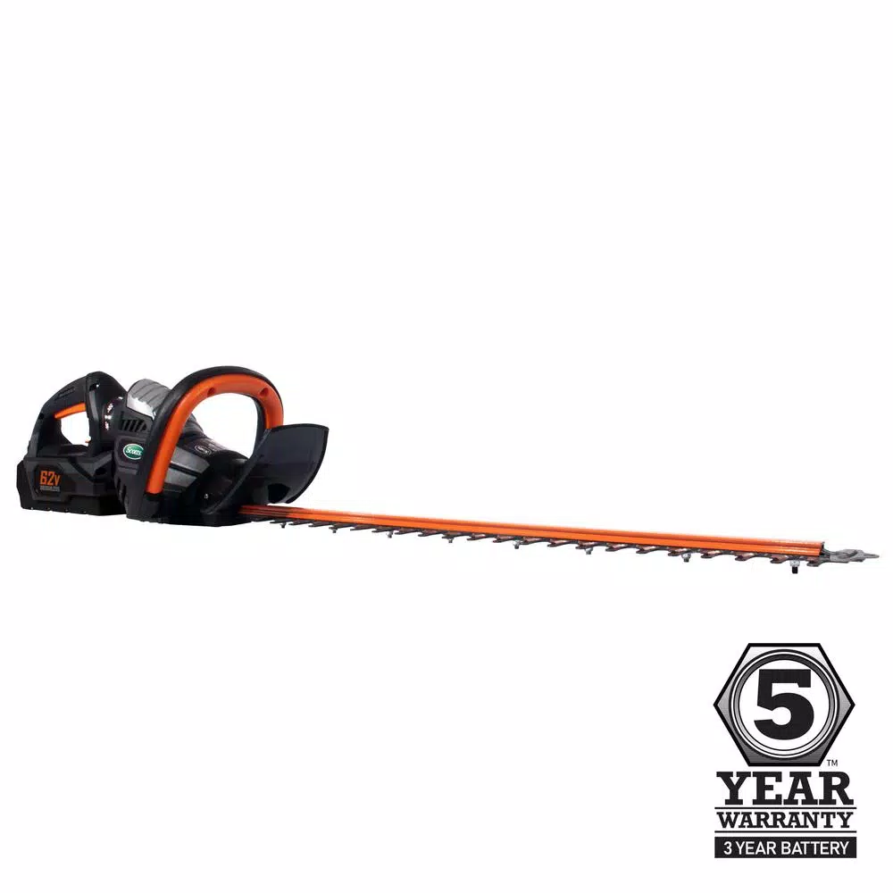 - Powerful 62-Volt hedge trimmer with battery and fast charger
