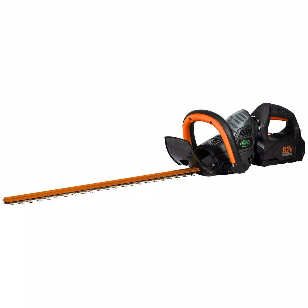 Scotts cordless hedge trimmer has a battery-operated brushless motor with 2-speed settings to choose from. Its bar delivers 3000 strokes per minute to cut hedges and bushes in your yard. The soft-grip handle is non-slip and comfortable to reduce arm and hand strain while trimming through branches. It has a wrap-around safety handle for cutting safety and precision, so you only get a clean cut in your yard. This Scotts 62v cordless trimmer includes a 62-Volt 2.5Ah battery and fast charger.