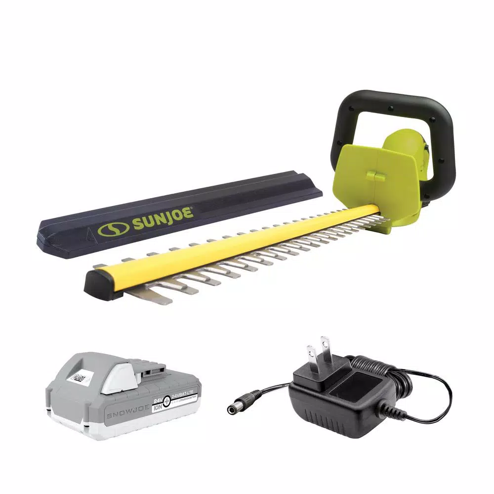 GET YOUR SHRUBS IN SHAPE. Give your hedges a haircut with cordless convenience from Sun Joe. Introducing the latest addition to the iON+ series: 24V-HT22-LTE 24-Volt Cordless Hedge Trimmer. Perfect for anywhere power is at a premium, 24V-HT22 features Sun Joes exclusive iON+ 24-Volt System, for Power To Go. The included 2.0 Ah battery offers eco-friendly, no-fade power + performance with up to 55-minutes of rechargeable runtime. Trim, hedge, edge and clean up your overgrown bushes, the robust 200-Watt motor and dual-action blades provide up to 40% less vibration than traditional, single-action machines. iON+ will quickly become your go-to tool to shear cleanly through shapeless shrubs. The 22 in., rust-resistant blades cut through branches, twigs and stems up to 0.6 in. thick for a perfectly groomed hedge every time. And with user-friendly features like the dual-handed grip, built-in safety switch to prevent accidental starting and front hand guard to protect against blade contact, Sun Joe makes cutting down your landscaping to-do list easier and safer than ever. So, to maintain a well-groomed garden, Go With Joe the 24V-HT22-LTE 24-Volt Cordless Hedge Trimmer from Sun Joe. GET EQUIPPED.