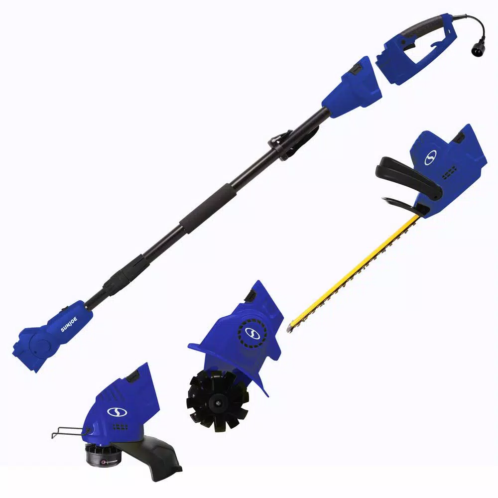 The Sun Joe Electric Multi-Tool Lawn Care System is like having a lawn crew in a box: 1 pole powers 3 robust tools to tackle everything from trimming the grass, to cutting the hedges and tilling the garden. The expandable garden tool system features 3 adjustable and interchangeable power heads and 5.9 ft. extension pole with removable handle to quickly convert from 19 in. 4.5 Amp. Hand-held trimmer to pole hedge trimmer; from 12 in. 3 Amp string trimmer to 6.3 in. 3.5 Amp tiller cultivator. Swap tools in seconds to do more in less time: trim hedges high and low, till the turf or trim the grass. Includes extension pole with removable handle plus string trimmer, hedge trimmer and tiller attachments. Cut your yard chores down to size and Go With Joe the Sun Joe Electric Multi-Tool Lawn Care System.